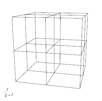 The Node Distance quality metric for a single element is the minimum distance between nodes within that element. Not every node is compared against every other node within an element, rather, a structured approach is used. For a single HEX27 element, the element can be subdivided using the 27 nodes to form 8 logical hexes with 8 nodes each. The edge lengths of the logical hexes are the distances considered for the HEX27 element. See the image below for a representation of the edges used to compute node distance in a single HEX27 element.