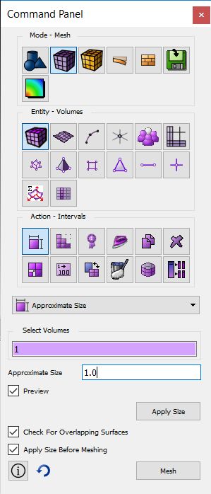 The volume shown in Step 5 will be meshed by sweeping a surface mesh from one side of the brick to the other. Before generating any mesh, the user must specify the size of the elements to be generated. In this example, one element size will be specified for the volume as a whole and a smaller size will be specified for around the hole. A direct interval setting will be specified for the sweep direction.
