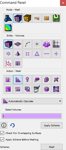 The volume mesh can now be generated. Again, the first step is to specify the type of meshing scheme that should be used and the second step is to issue the order to mesh. In certain cases, the scheme can be determined by CUBIT automatically. For sweepable volumes, the automatic scheme detection algorithm also identifies the source and target surfaces of the sweep automatically.