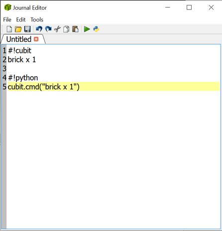 The Journal File Editor can be used to create a new Python or Cubit command script. By default, a new journal file will be in Cubit command syntax. Enter the commands in the order you want them executed. You can play the commands all at once using the play button on the toolbar. You can also play a few commands at a time. Select the commands you want to play. Then, right click and select the "Play Selected" menu item. If you have a Cubit script, you can convert it to a Python script by hitting the Python toolbar button. If you have a few lines you want to convert to Python, select them, and right click to get the popup menu and choose "Translate Selected to Python"