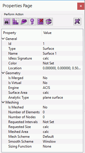 The Property Editor is a window that lists properties about the current entity selection. Some of the properties, like CUBIT ID, entity type, or geometry engine, are listed for reference only. Other attributes, like name, or mesh intervals, color, mesh scheme, or smooth scheme can be edited from the window. The Property Editor is located on the left panel in the GUI. The highlighted entity/entities in the graphics window are listed in the property editor window. The Property Editor also lists information about selected mesh entities, boundary conditions, and assemblies. Selecting an object from the Tree View will also open the object in the property editor.