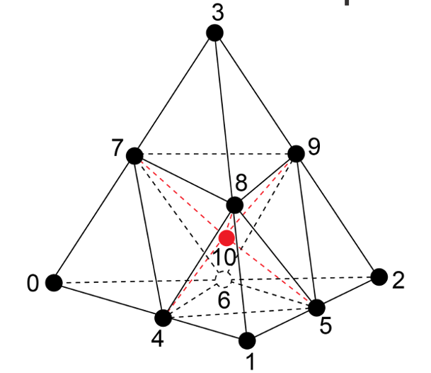 Normalized Inradius: Ratio of minimum subtet inner radius to tet outer radius (circumsphere). Subtets are defined by subdividing the tet into 12 smaller tets by using a common point at the centroid of the tet and the 6 mid-edge nodes as shown in Figure 1. The minimum in-radius of any of these 12 tets normalized by its parent outer-radius and a constant is used to determine this metric. The Normalized Inradius metric is also valid for linear elements, except that all mid-edge nodes are defined as the midpoint of their corner nodes.