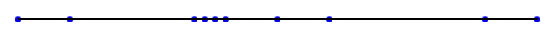 The Pinpoint scheme allow the user to specify exactly where on a curve to place nodes. The list of doubles are absolute positions, measured from the start vertex. The user can enter as many as needed, and they do not need to be in numerical order. Below is an example of a curve that has been meshed using the following scheme: