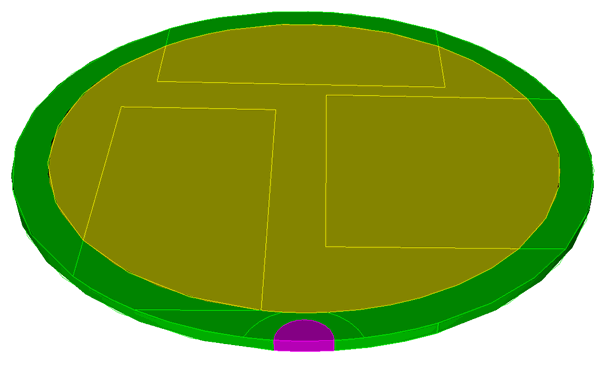 1. Redistribute option ON will affect all mapped surfaces, not just the linking surfaces of a swept volume. Even though the example below shows a swept volume, the command can be used independent of the sweeping command. That is, it can be used while meshing surface models that contain mappable surfaces.