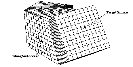 The sweep algorithm can sweep general 2.5D geometries and can also do pure translation or rotations. A 2.5D geometry is characterized by source and target surfaces which are topologically similar. The hexahedral mesh is swept (extruded) between source and target along a single logical axis. Bounding the swept hexahedra between source and target surfaces, are the linking surfaces. Figures 1 and 2 show examples of source, target and linking surfaces.