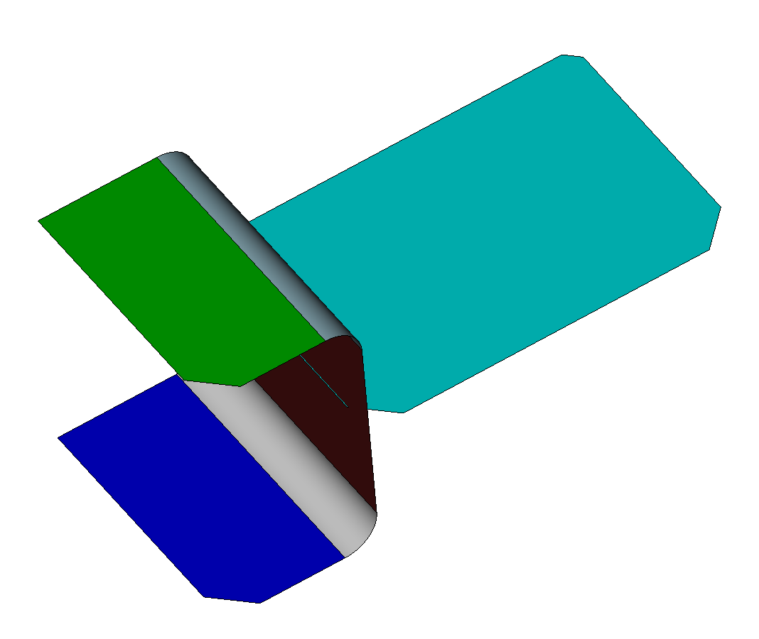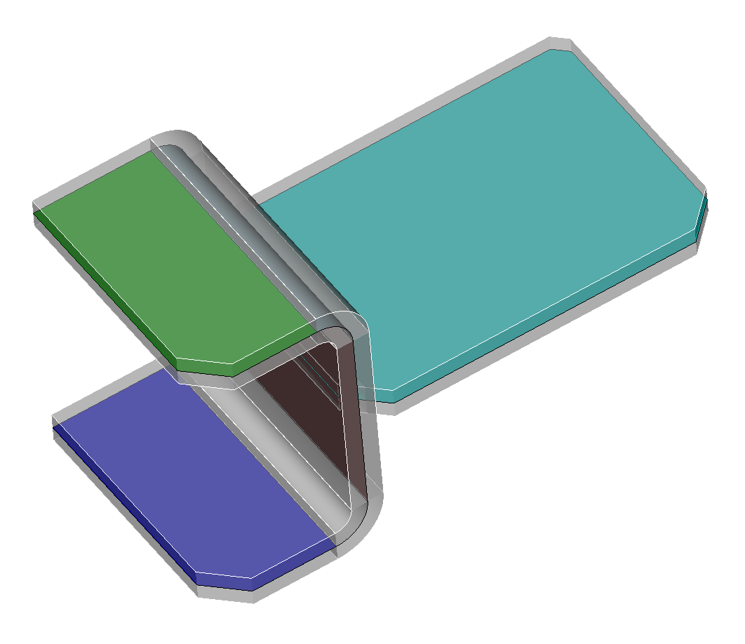 The thickness value is a positive floating number that indicates the thickness of the offset volume in a direction normal to the sheet volume. The loft option should be a value between 0 and 1 indicating where the preview volume will be displayed with respect to the sheet volume. A loft value of 0 will display the volume offset in the direction of the sheet volume surface normal. A value of 1 will reverse the direction of the offset. A value of 0.5 will display the volume centered on the sheet volume (as shown in the figure above). A color using one of Cubit's standard color keywords should also be specified. The transparent option can also be used to display the offset volume in transparent mode. Transparency can also be useful when using the add option so that both the sheet volumes and their offset volumes can be visualized together. The include_normal will display an arrow at the center of the sheet volume's surfaces indicating the normal direction of each surface
