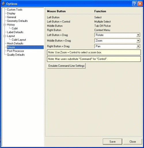 There are two different default paradigms for view navigation: Cubit command line and Cubit GUI. The user is allowed to customize the mouse settings as desired. Mouse settings in the GUI are modified by accessing the Tools pull-down menu, then select Options. The Mouse Settings dialog is shown below (See Mouse-Based Navigation for the command line version).