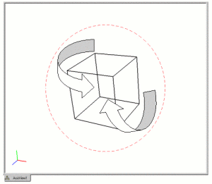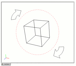 Where the cursor is in the graphics window will dictate how the view will be rotated. If the cursor is outside of an imaginary circle, shown in Figure 2, the view will be rotated in 2d, around an axis normal to the screen. If it is inside the circle, as in Figure 3, the rotations will be in 3d, about the current view spin center. The spin center can be changed to any x-y-z location. The most common way is by zooming to an entity, which changes the spin center to the centroid of that entity. The "view at" command will change the spin center without zooming: