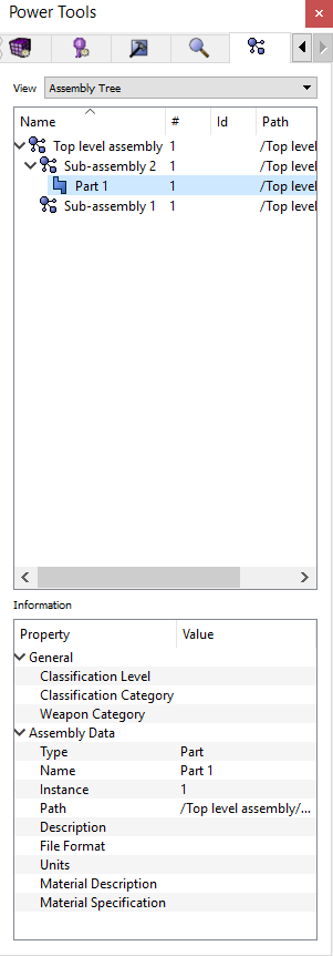 In Cubit versions prior to 15.4 assembly data was managed on the model tree. Beginning with Cubit version 15.4 a power tool for assemblies is available.