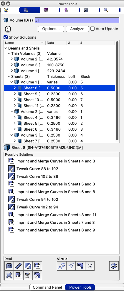 Figure 1. Thin Volumes diagnostic displayed with Solution window. Reduce solutions show for volume in figure 3. |
