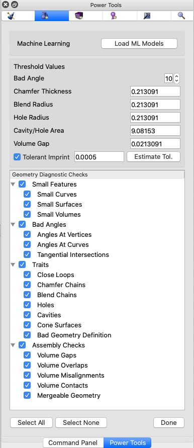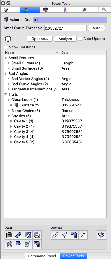 blend or hole radius, cavity area and volume gap thresholds.