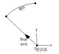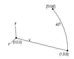 The location 1 0 0 was swung 45 degrees about an axis defined by a vector in the z direction and an origin at 0 0 0.