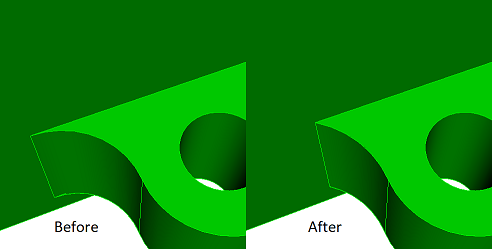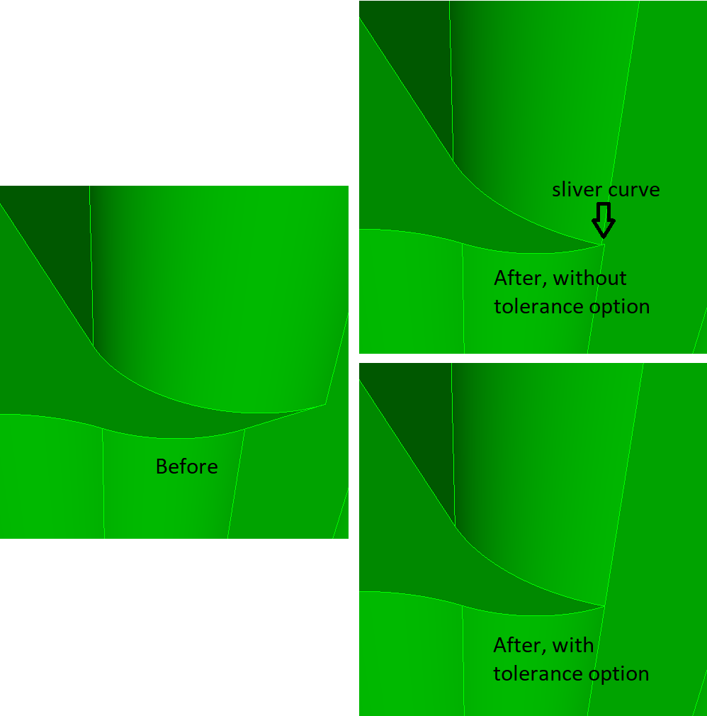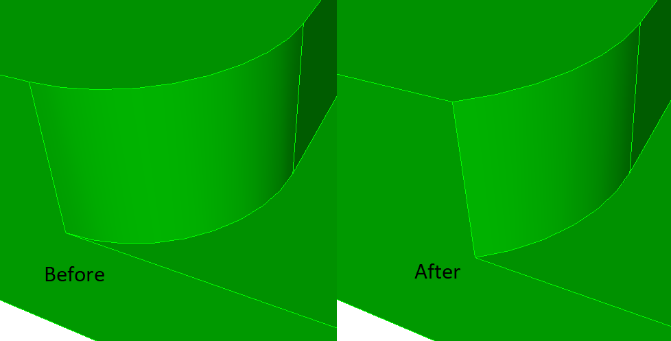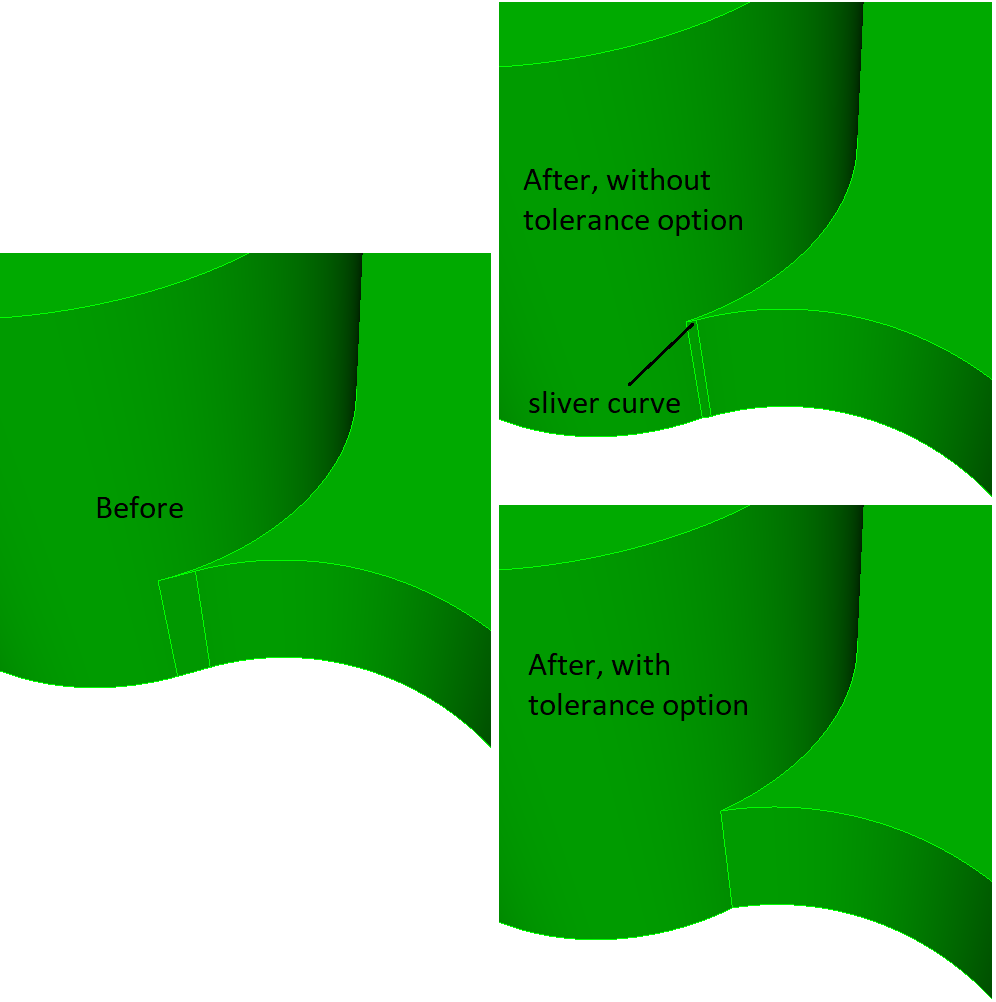 The second form of the command replaces the surface with the radius at the vertex with a larger radius surface, increasing the angle. The command tweaks the surface that results in the least amount of material removed (Figure 4) or added (Figure 5). The angle option works the same as in the first form of the command. The offset surface option specifies which surface is tweaked (offset), as sometimes the surface that results in the smallest material added/removed is not correct. The tolerance option prevents small curves from being created, snapping to adjacent vertices within the tolerance (Figure 6) or possibly modifying an adjacent surface (Figure 7).