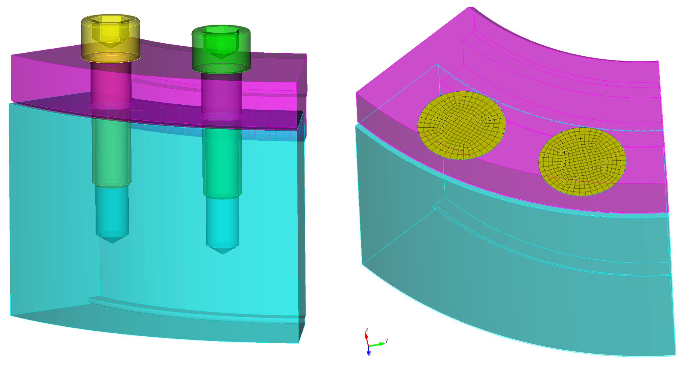 Figure 2. Example of before and after where the reduce bolt patch command has been applied to two bolts. This example uses the mesh and default fill and delete options.