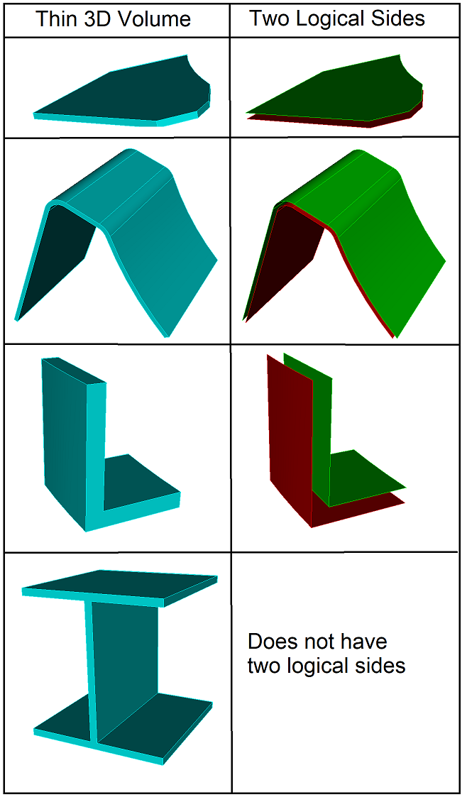 It is also important to note that only 3D thin volumes that have two logical sides can be automatically reduced. For example, a piece of sheet metal, bent or pressed into most shapes has two logical sides. 3D thin volumes with t-junctions do not have two logical sides. See figure 2 below for some examples.