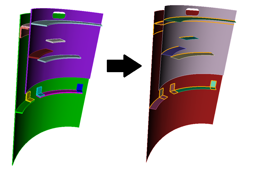 The Thin Auto version (illustrated in figure 1) automatically reduces a set of 3D thin volumes into a connected set of sheet bodies based on an internal geometric reasoning algorithm resulting in sheet bodies that are connected at shared (merged) curves. It will also automatically build thickness, loft and block information. The copy and midsurface versions of the command are more prescriptive, and offer more control so that specific required reductions can be performed. The copy option can be used to prescribe a few required reductions in an assembly prior to automatically reducing the remainder with the reduce thin auto command.