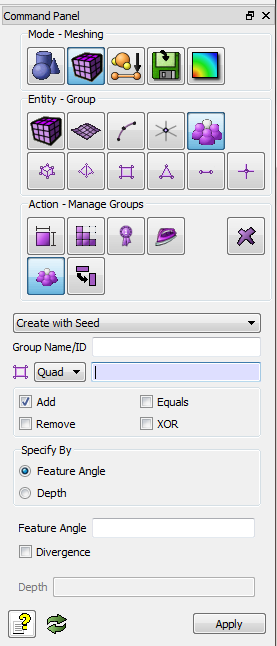 Group {<'name'>|<id>} {Add|Equals|Remove|Xor} Seed <mesh_entities> {Feature_angle <angle> [Divergence]|Depth <number>}