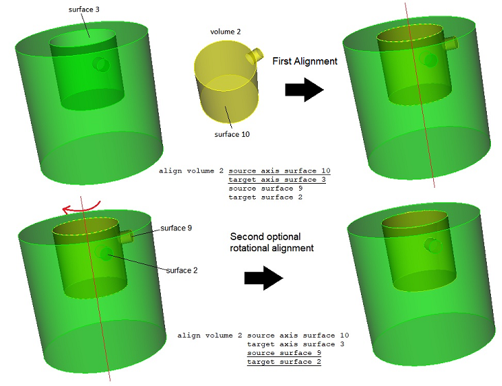 The first align command will transform the specified volumes by computing a transformation that aligns the source axis or surface with the target axis or surface such that the source axis centroid or surface centroid is coincident with the target axis origin or surface centroid and the surface normal(s) and/or axis(s) are pointing either in the same or opposite direction (depending on their initial alignment). The source surface need not be in the specified volumes. If the [reverse] option is specified, the resulting alignment is flipped 180 degrees.