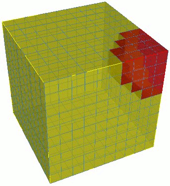 Figure 1 shows an example of a partitioned volume. A cube that has been map meshed is partitioned using a center at one of its vertices. The result is two distinct volumes with a surface separating the two. The interface surface is composed of the faces of the interior hex elements.