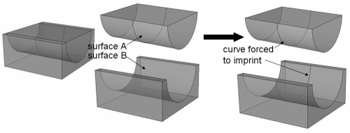 In some cases one or more curves may not have been correctly imprinted onto an overlapping surface which may be preventing merging. This may again be the result of a tolerance mismatch in the CAD translation. If this situation is detected a tolerant imprint operation may be performed which will attempt to imprint the curve onto the adjacent volume. Figure 3 shows an example where a curve on surface A is forced to imprint onto surface B using tolerant imprint, because it did not imprint during normal imprinting. The solution of a curve of surface A to be imprinted onto surface B may be presented to the user if all 3 of the following conditions are satisfied: