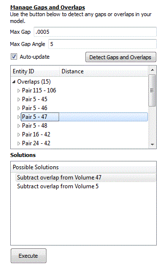 The Manage Gaps/Overlaps Tool within the geometry cleanup area of ITEM allows the user to quickly search an assembly for gaps and overlaps between assembly components. The search criteria for gaps is a tolerance specified by the user and defines the maximum gap between components to look for. A gap angle can also be specified which specifies how "parallel" two entities must be to be considered in the gap check. The overlap check simply asks Cubit to see if any of the volumes are overlapping and doesn't require a tolerance from the user. The results are displayed in a list of pairs of volumes. The user can right-click on these pairs and tell Cubit to draw the pair. A useful graphical depiction of the gap or overlap will be displayed. When the user clicks on a pair in the list a set of solutions for fixing the gap or overlap will also be displayed below in a separate list. The user can select a solution and click the "Execute" button to execute it. The gap solutions are either a surface "tweak" operation and the overlap solution can be either a tweak operation or a Boolean operation to remove the overlap. This tool provides a powerful way to quickly work through the assembly and fix gaps and overlaps.