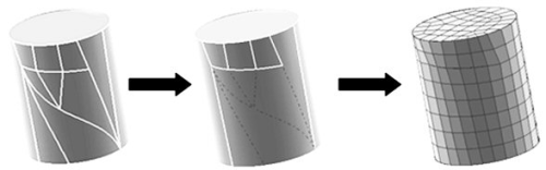 Solutions: If linking surface problems are identified ITEM will analyze the surface and generate potential solutions for resolving the problem. Compositing the problem linking surface with one of its neighbors is a current solution that is provided. ITEM will look at the neighboring surfaces to decide which combination will be best. When remedying bad interior angles the new interior angles that would result after the composite are calculated in order to choose the composite that would produce the best interior angles. Another criterion that is considered is the dihedral angle between the composite candidates. Dihedral angles close to 180 are desirable. The suggested solutions are prioritized based on these criteria before being presented to the user. Figure 1 shows an example of a model before and after running the forced sweepability solutions. The top and bottom of the cylinder were chosen as the source and target surfaces respectively.