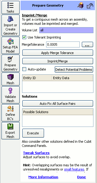 After determining the smallest feature size, click on the Estimate Merge Tolerance button to come up with a rough estimate for the merge tolerance. It is important to note that this is only an estimate. After an initial estimate is made, it can be fine tuned using the Fine Tune Merge Tolerance tool.