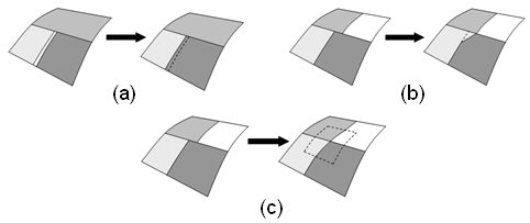 The second solution for eliminating small curves is the collapse curve operation. This operation combines partitioning and compositing of surfaces near the small curve to generate a topology that is similar to pinching the two ends of the curve together into a single point. The partitioning can be done either as a real or virtual operation. Figure 1(b) illustrates the collapse curve operation.