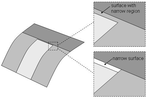 Narrow regions/surfaces are also recognized using the characteristic value of e. The distance, di from the endpoints of each curve in the surface to the other curves in the surface are computed and compared to e. When di<e other points on the curve are sampled to identify the beginning and end of the narrow region. If the narrow region encompasses the entire surface, the surface is classified as a narrow surface. If the region contains only a portion of the surface, it is classified as a surface with a narrow region.