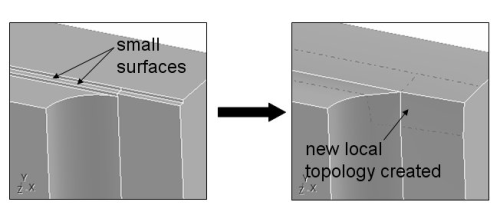 Solutions: ITEM provides four different solutions for eliminating small and narrow surfaces from the model. The first solution uses the regularize operation. Regularize is a real operation provided by the solid modeling kernel that removes unnecessary/redundant topology in the model. In many cases a small/narrow surface's definition may be the same as a surface next to it and therefore the curve between them is not necessary and can be regularized out. An example of regularizing a small/narrow surface out is shown in Figure 3.