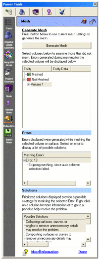 The mesh generation panel in ITEM is different from the other panels in Cubit. Meshing errors can arise from a number of different problems. Many of these problems are caused from improper geometry preparation/cleanup. Other problems can be caused from improper interval settings, or meshing schemes. Instead of suggesting specific operations as it does on other panels, the meshing panel in ITEM will suggest several possible solutions based on the error message output. Each of these solutions may require significant user input, and may require you to revisit previous ITEM panels or Control panels. To open the appropriate Control panel, you can right click on the solution and select "Show Command Panel". For convenience, these general solutions are described here, including which ITEM panels and which Control panels they refer to. References to help topics are also included.