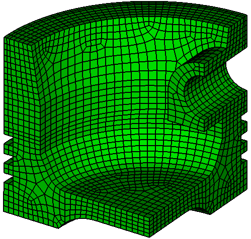 Figure 5. Output mesh from the command "Scale Mesh Multi 2 force_structured in Surface 108". The desired features are maintained, while swept blocks are used in unimportant regions.