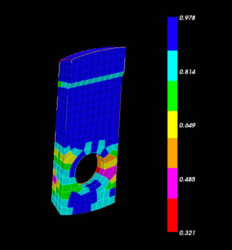 If the user specifies draw histogram, then histograms are drawn in a separate graphics window. The window contains one histogram for each quality metric. If the user specifies draw mesh, then the mesh elements are drawn in the default graphics window. A color-coded scale will appear in the graphics window. The histogram and mesh graphics are color coded by quality: a small metric value corresponds to red, a large metric value to blue and in-between values according to the rainbow. You can grab the side of color bar and resize it. The text gets smaller as the color bar width decreases. You can also grab in the middle of the color bar and move it around. It can be repositioned to the bottom or top and it will automatically change orientations. See Figure 1.