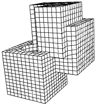 In general, the procedure for using the sweep scheme is to first mesh the source surfaces. Any surface meshing scheme may be employed. Figure 1 displays swept meshes involving mapped and paved source surfaces. Linking surfaces must have either mapping or submapping schemes applied. The sweep algorithm can also handle multiple surfaces linking the source surface and the target surfaces. An example of this is shown in Figure 2. Note that for the multiple- linking-surface meshing case, the interval requirement is that the total number of intervals along each multiple edge path from the source surface to the target surface must be the same for each path. Once the appropriate mesh is applied to the source surface and intervals assigned, the mesh command may be issued.