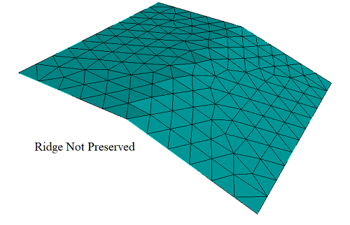 The ridge_angle setting is only used when meshing discrete surfaces (composites or facet/mesh-based geometry surfaces). It is the threshold for deteremining when to preserve lines (ridges) defined in the discrete surface. Lines in the discrete surface having a dihedral angle larger than ridge_angle will be preserved in the generated triangle mesh. In Figure 7, the composite surface has a dihedral angle of 17° at its ridge. In the first image ridge_angle is set to less than 17° so the ridge is preserved. In the second image ridge_angle is set to greater than 17° so the ridge is not preserved.