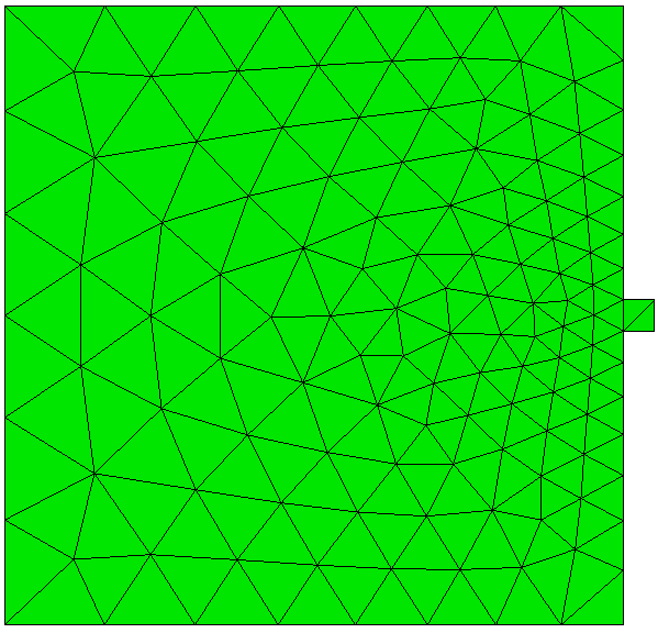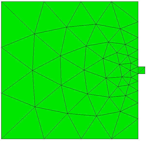 The TriMesh scheme is usually very good at generating a mesh with its default settings. In most cases no adjustments to default settings are necessry. Using the size assigned to the surface, either assigned explicitly or defined with an auto size, the TriMesh scheme will attempt to maintain the assigned size, except where features smaller than the specified size exist. In this case, smaller triangles will automatically be generated to match the feature size. The triangle mesher will then generate a smooth gradation from the small triangles used to capture features, to the size specified on the surface. This effect is shown in figure 1 where the transitions in triangle sizes can be seen. If no size is specified on the surface, it will use the size that was set on its parent volume. User defined sizes and intervals can also be assigned to individual curves for more specific control of element sizes.
