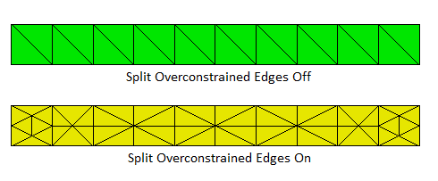 The global Split Overconstrained Edges, if set to on, splits edges owned by the surface, but with both nodes on curves. This feature can help when two elements through the thickness of the mesh is desired. Figure 7 shows the effect of this option.