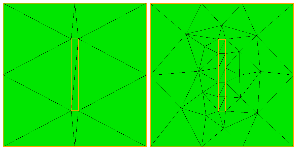 Surface gradation will control the growth of triangles where element size has been determined by bounding curves. For example, Figure 4 shows a small feature where element sizes have been determined locally by the length of the small curves. A gradation is applied so that triangle sizes increase away from the small feature. A surface gradation of 1.3 is shown on the left, while a surface gradation of 1.1 is shown on the right.