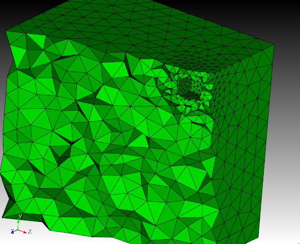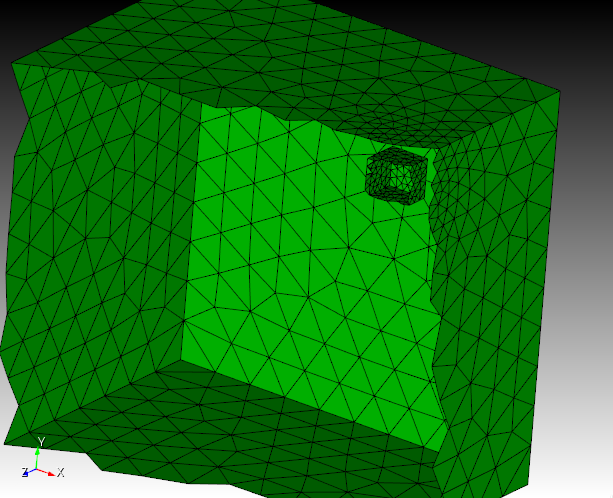 Figure 5a. An example of a cut-away mesh with a volume gradation, where the small size on the interior void propagates to the exterior surfaces
