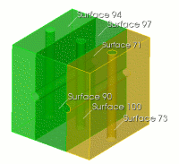 All of the volumes in this model are now one-to-one sweepable. However, the source and target surfaces for the main block portions must be set explicitly