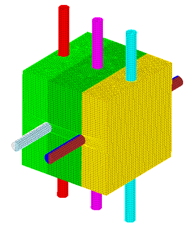 In this model it is possible to have different sweep directions since the surfaces which overlap are both linking surfaces. The final mesh is created with a mesh size of 2 and is shown below.